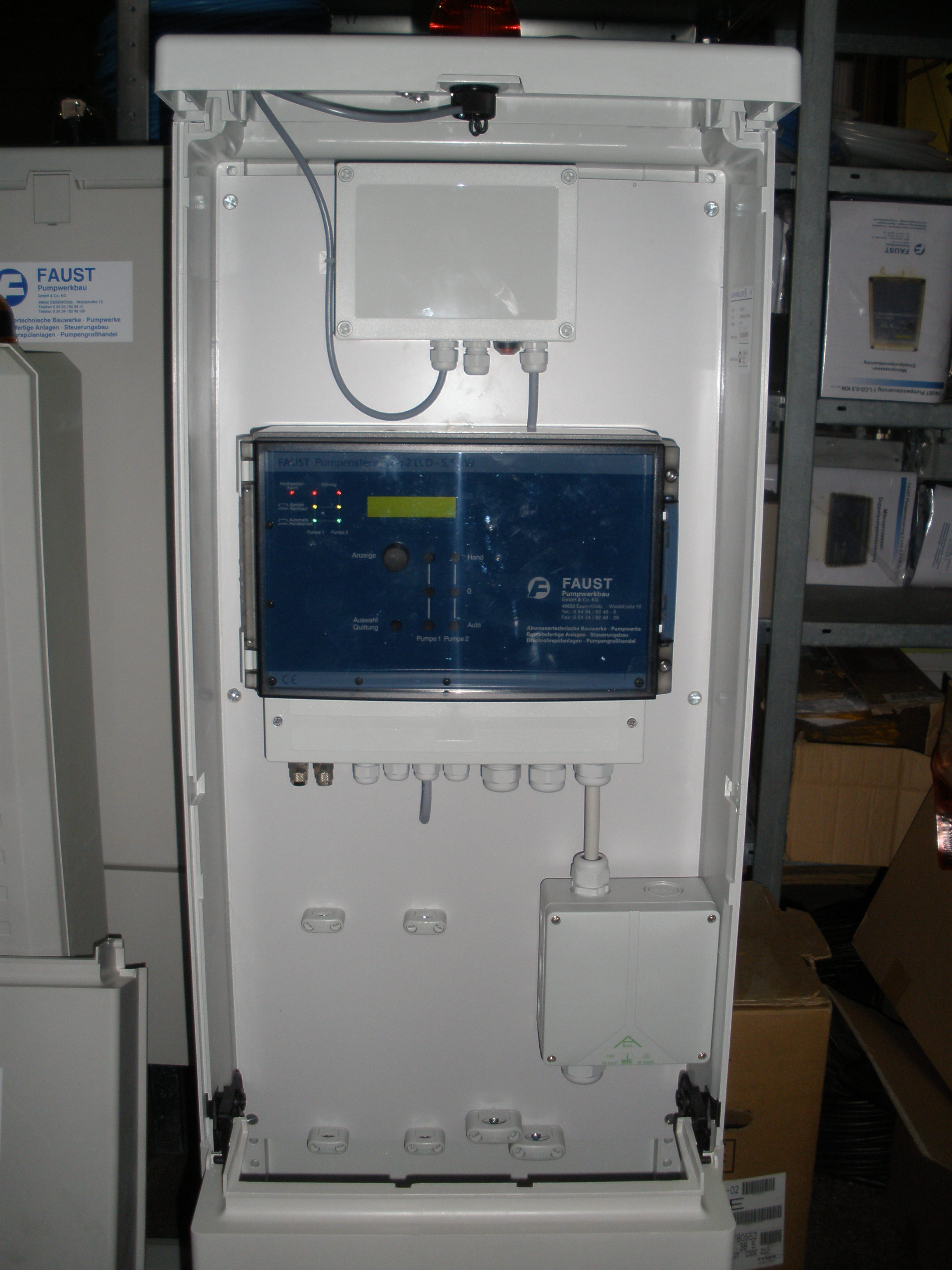 Die FAUST Pumpensteuerung 2 LCD – 5,5 kW zeigt die Betriebszustände über LED’s an. Über die LCD – Klartextanzeige werden benötigte Informationen und Alarmmeldungen angezeigt. Mittels des Digitalpotentiometers und dem Auswahltaster ist eine besonders einfache Bedienung und Einstellung des Pumpwerkes möglich. Die Niveauerfassung kann wahlweise über eine oder zwei Staudruckglocken, über eine geschlossene Meßglocke (plus optionalem zusätzlichem Aufnehmer für Hochwasser und Noteinschaltung z.B. Schwimmerschalter), über einen elektronischen Druckaufnehmer 4-20 mA (plus optionalem zusätzlichem Aufnehmer für Hochwasser und Noteinschaltung z.B. Schwimmerschalter) oder über drei oder vier Schwimmerschalter erfolgen. Die Pumpen können zusätzlich mittels Hand-Null-Automatiktastern bedient werden.